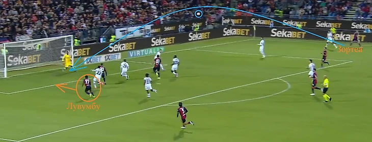 Дальше пошли одна за другой проблемы «Милана» в обороне после навесов. На 45й минуте Зортеа подал справа, Эмерсон упустил оппонента и Лувумбу делал скидку вдоль ворот, но Пикколи не смог внятно пробить.