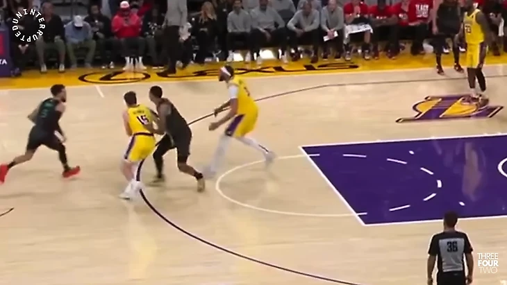 Леброн: Я мешаю выносу мяча, я просто беру на себя Джей Джея, а защитник, который несся за ним, просто отступает к игроку за лицевой.