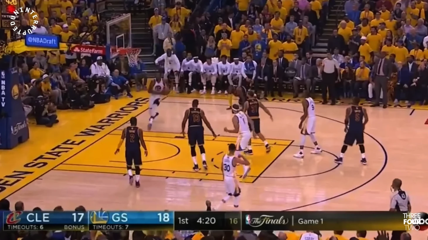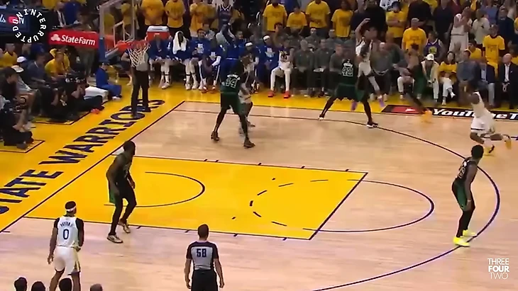 Когда они выводили мяч из-за S.O.B. и я делал «2.9» на сильной стороне, потому что они собирались сыграть какой-то Post split, в этот момент Карри получает мяч для вброса и бросает его просто через всю площадку на слабую сторону перед их скамейкой запасных прямо передо мной, я пытаюсь сблизиться с КД, поскальзываюсь, падаю на паркет, КД врывается под кольцо и забивает сверху.
