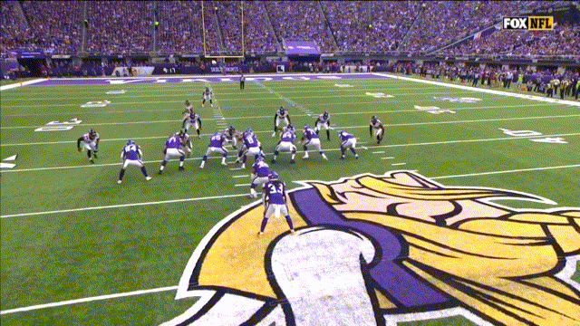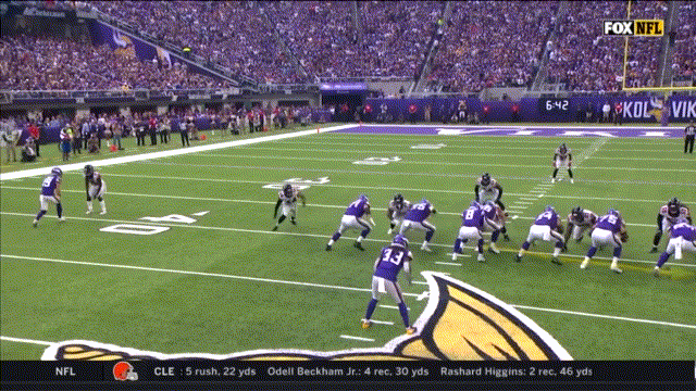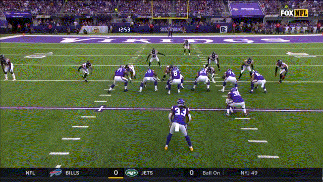 Следующий драйв Миннесоты состоял и 4 розыгрышей, на одном из которых Казинс умудрился потерять мяч. Да, это был, конечно же, пасовый розыгрыш. Тем не менее, на втором плее Викинги сыграли комбинацию, которая сочетала в себе аутсайд зону и пулл плейсайд гарда.