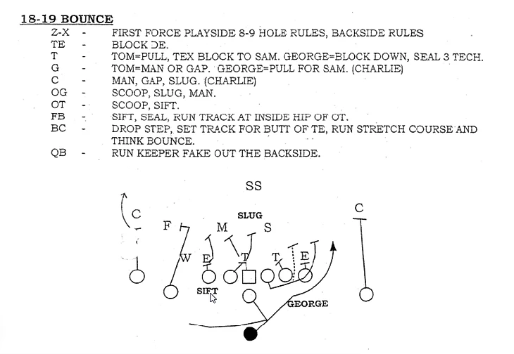 Вот тут-то я и почувствовал – запахло олдскулом. Поскольку я не знал, как называется этот розыгрыш, я начал копать и копать глубоко. Первое что я освежил в памяти - это был павер-свип Ломбарди, потом ковырял пин-энд-пулл зону и совсем отчаялся докопаться до истины, но удача мне улыбнулась. В твиттере я наткнулся на статью Ника Олсона, который разбирал выносные комбинации Миннесоты в матче первой недели. И вторым розыгрышем, который он показал, был как раз тот, на котором я завис. И знаете, как он назывался? Баунс!