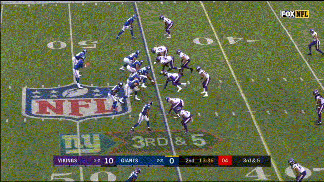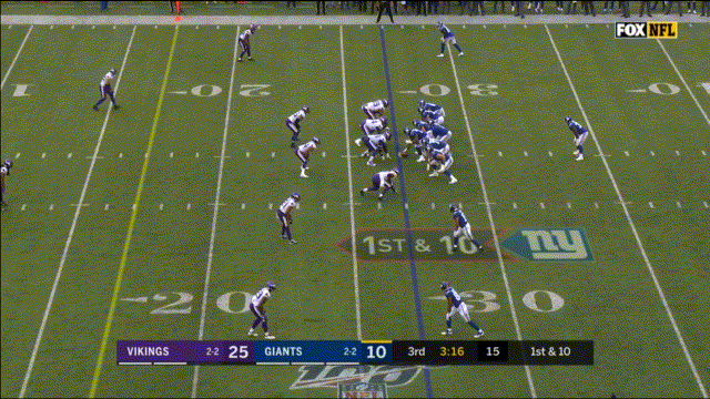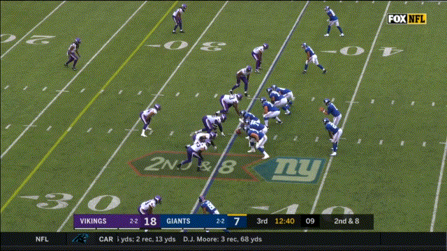 Итак, первый драйв Гигантов. Чем он интересен? Во-первых, тем, сколько оказывалось давления на Джонса. Из 9 розыгрышей в 4 на него оказывалось давление в 5 и более человек. То есть на него блицевали. Зиммер уже отошел о своей канонической манеры блицей на 3-х длинных и атаковал Джонса на 1-10, 2-7, 3-7, 2-8. Это в попытках и ярдах, если кто не понял. Кроме того, на последнем плее драйва на 3 и 8, он показывает 2-А блиц, но лайнбеккеры просто откатываются в зоны. Какой коварный старик, скажете Вы и будете правы. В тех попытках, когда квотербека Гигантов блицевали, Барр был задействован 100%. Независимо от фронта. За ранинбека в этих розыгрышах, да и большую часть матча отвечал Кендрикс. Так же в первом драйве был использован фронт 3-3-5, в котором Барр занимает место эджа.