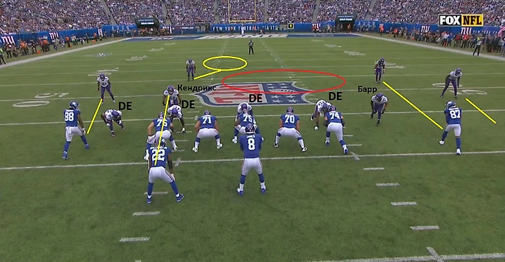 Фронт больше похож на одну из вариаций 3-4, особенно тем, что Гриффен и Барр стоят в 9-й технике, а так же расположением интериор лайнменов, но на этом сходство заканчивается. Прикрытие персональное с одним сэйфти в глубокой зоне, что похоже на кавер-1. Обратите внимание на ярко выраженную позицию Кендрикса, который кроет ранинбека. Его положение позволяет не только оставаться максимально близко к опекаемому, но и блицевать. Несмотря на вполне очевидные дыры в таком прикрытии (одна из них обведена красным и Шурмур нащупает это слабое место) не все так просто и любой из рашеров может оказаться защитником ближней зоны. Тем более, что все они обладают необходимой скоростью для этого. Это еще один плюс такого персонала.