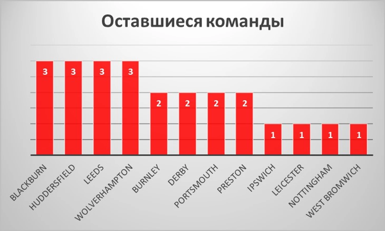 Интересно, что среди других городов, чьи команды побеждали в Чемпионате Англии меньше четырех раз, ровно 4 команды с тремя чемпионствами, 4 - с двумя, и 4 - с одним.