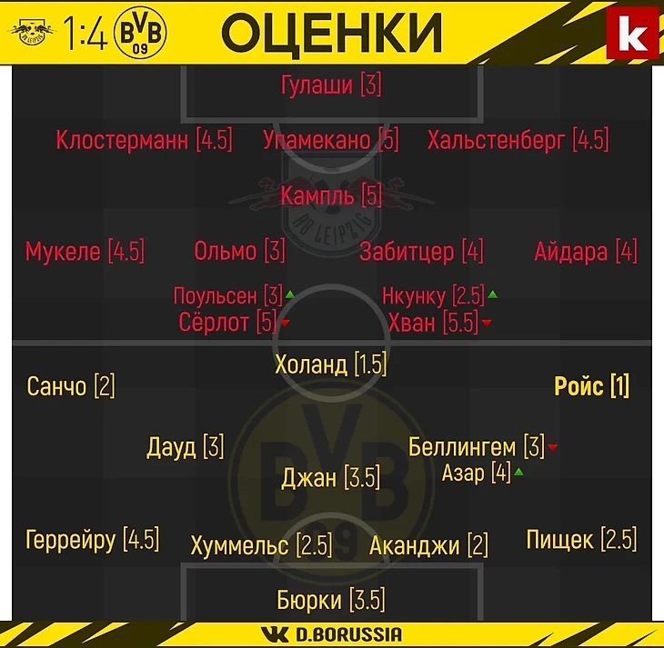От такого первого тайма Лейпциг так и не мог оправиться, центра поля в лице Дани Ольмо и Маршеля Забитцера не могли нечего предоставить целеустремленному Дауду и Беллингему. Норвежец Сёрлот и кореец Хван на двоих смогли создать всего лишь 2 опасных момента.