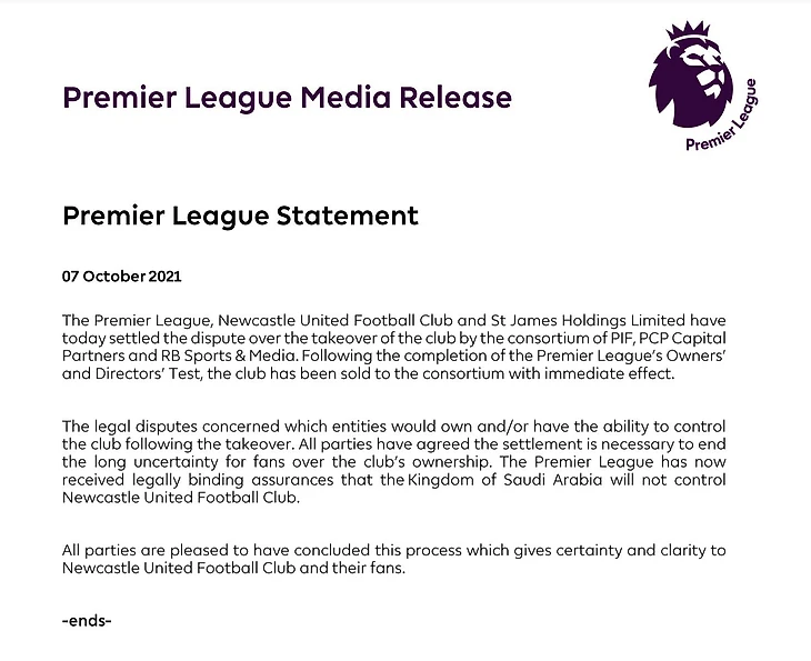 Официально, 7 октября было объявлено, что консорциум, включающий Фонд государственных инвестиций правительства Саудовской Аравии (PIF – Public Investment Fund) - получили контроль над 80% акций клуба, PCP Capital Partners и RB Sports & Media (по 10%), стали новыми владельцами «Ньюкасла». Премьер-лига сообщила, что все юридические разногласия между сторонами улажены, а гарантии того, что Королевство Саудовская Аравия не будет контролировать клуб, получены. Таким образом, Майк Эшли, находившийся во главе клуба на протяжении 14 лет, завершил процедуру его продажи. Как сообщалось ранее, сделка оценивается в 300 миллионов фунтов.