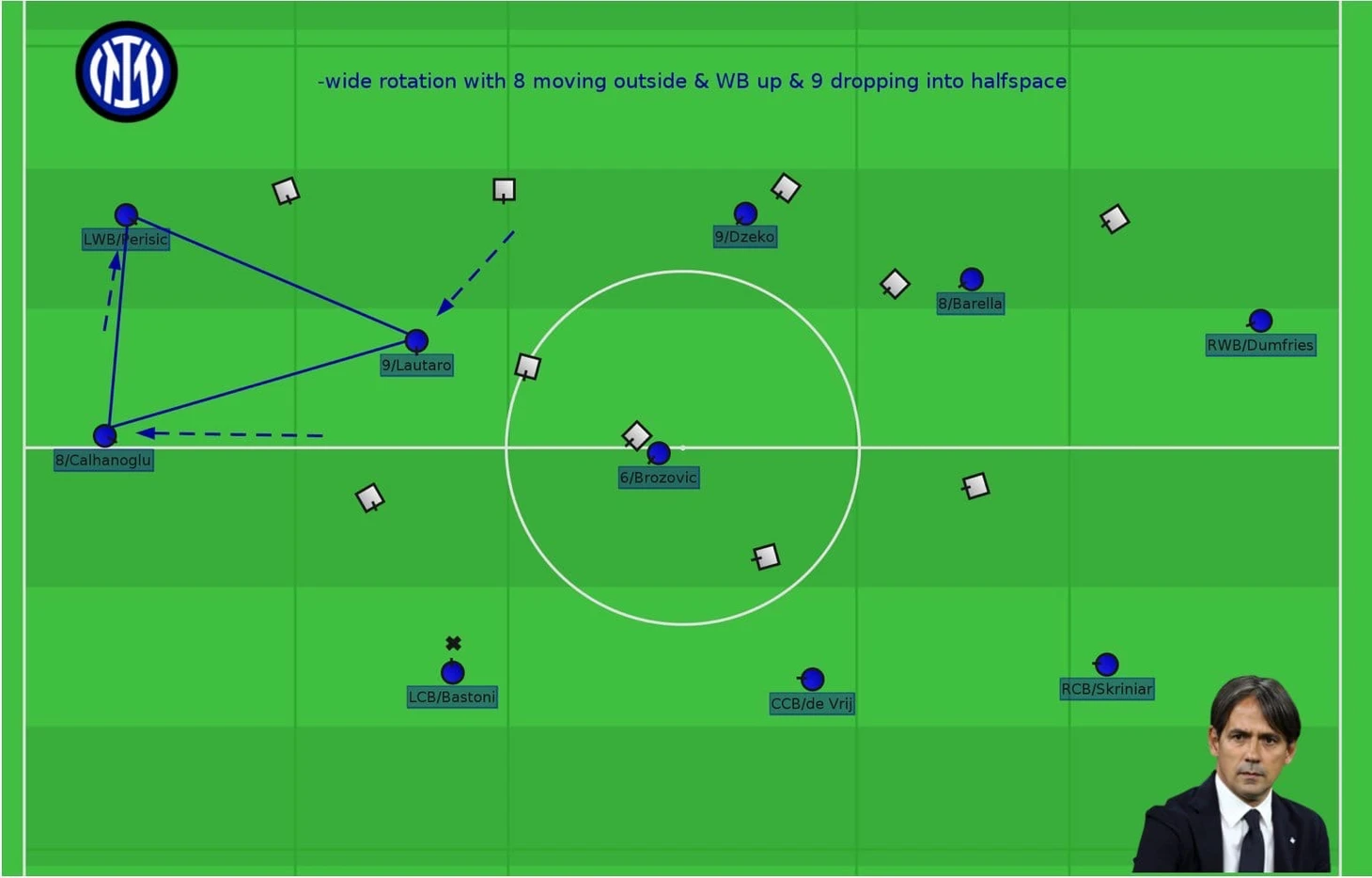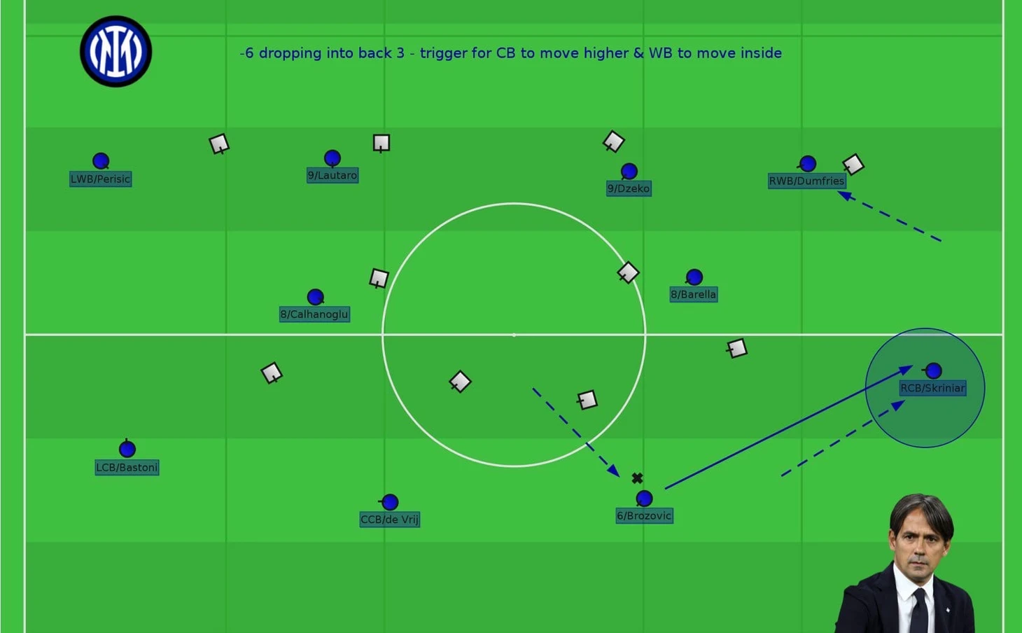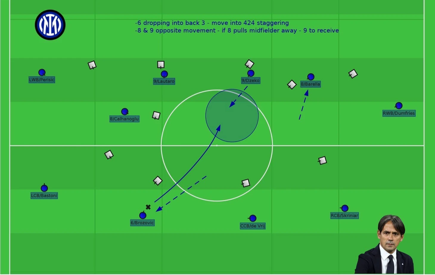 Определяющими в структуре Индзаги становятся Брозович и Чалханоглу, которые от ситуации решают через кого будет начинаться атака и как команда будет распоряжаться мячом.