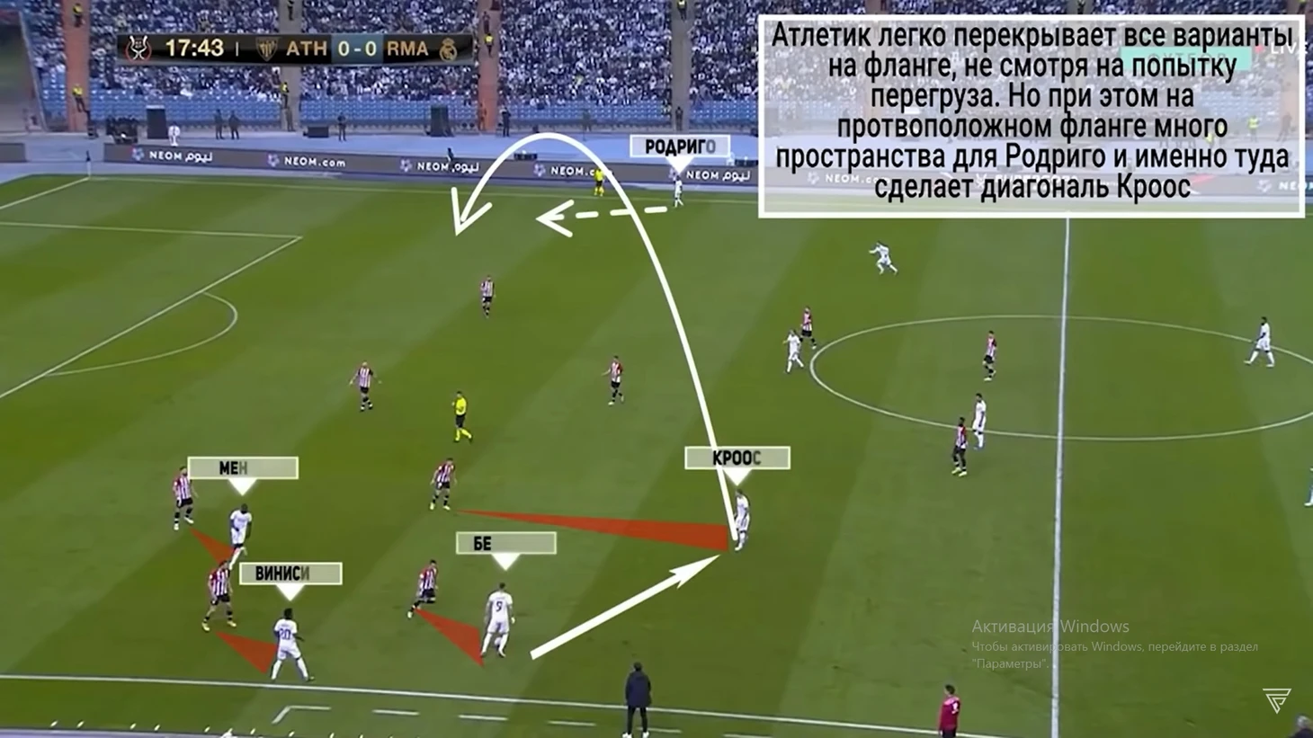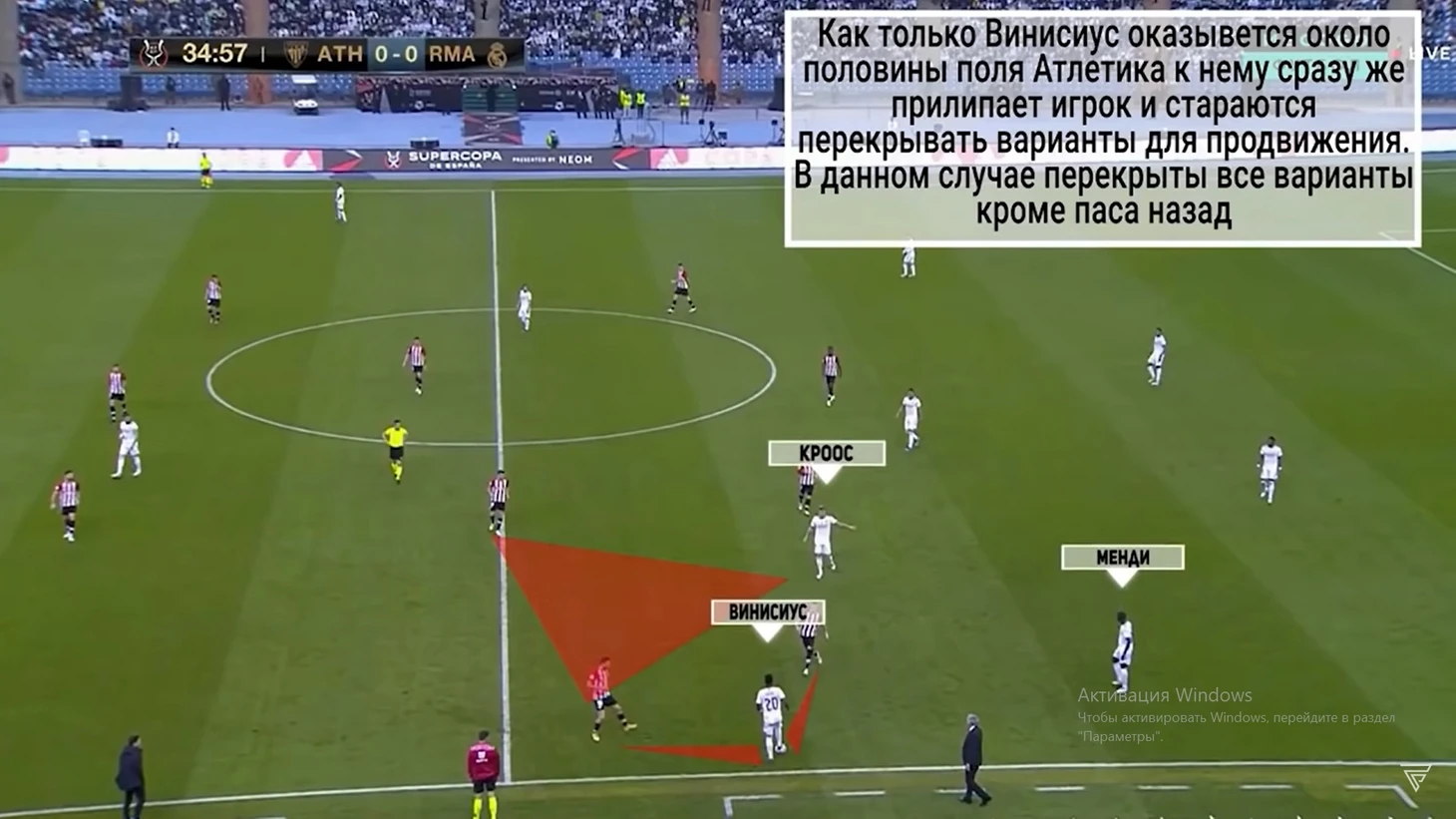 27 минута 1-ый удар в створ Реала. 3 в 3 при прессинге фланга Винисиуса и Алабы заканчивается капитуляцией атаки "Реала"... Начо выдвигается помогать Алабе, который не справляется с Уильямсом младшим. И Милитао, который смещается в зону Начо не справляется... Круговая подстраховка никак не помогает и в первом тайме "Реал" по делу мог получать уже два.