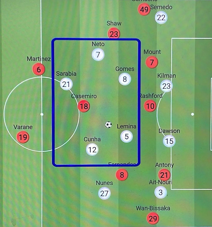 Открывает простую возможность для клуба в поисках баланса и позиционной атаки. Пара центральных защитников и Люк Шоу (слева) образуют тройку защиты, Каземиро (6 на фото) получает функцию якоря, подчищая все возможные проблемы. Диогу Дало (4 на фото) вместе с атакующей пятеркой дает ширину, растягивая вжавшихся в свою треть поля соперников. Таким образом отмычка для распространенных автобусов проста: даже в узком пространстве футболисты благодаря построению смогут ловить соперника благодаря изоляции 1 в 1 или перегрузке какой-либо зоны. На предсезонке Лисандро Мартинес добавлялся в опорную зону, что может облегчить давление на Каземиро, а то и вовсе отрядить его 7-м футболистом в атаку (такое мы будем видеть редко). Вакантное место в тройке сзади занимает новичок - Онана, открывая для обывателей роль: вратаря-либеро.