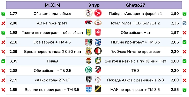 Тур открывался самым курьезным матчем сезона. Уже к 10 минуте молчащий много туров Алмере вел 2-0, и, если первый гол был забил классно лучшим игроком гостей Тома Робине, то второй - самый нелепый автогол сезона (https://youtube.com/shorts/a85UCDadNpU?si=Lt4xNZ7Lzm4GB_gv) Йерун Рейсдейк на 33 минуте заменил троих защитников, видимо, из-за такого раздолбайства. Спарте удалось отыграться в первые 10 минут второго тайма, сначала точный дальний удар нанес Камил Негли, а через 6 минут Пелле Клемент в касание замкнул прострел Шарля Брыма. Обе команды забьют / 1,77 ✅