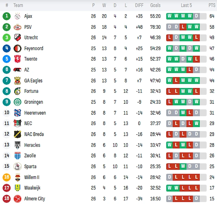 «Утрехт» в своем репертуаре. Одержать волевую победу в гостях у «Виллема» 3:2, чтобы дома тухло проиграть НЕКу 0:1. Несмотря на все осечки, они до сих пор занимают 3 строчку, тут уж помогает что «Фейеноорд», который уступает на 2 очка, имеет игру в запасе.