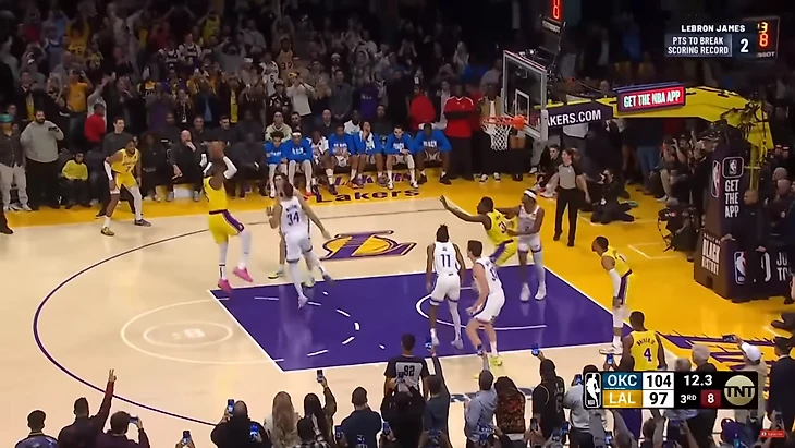 В истории баскетбола очень много офигенных моментов: чемпионства Майкла Джордана и Билла Рассела, клатчи Лилларда, рекорд Стефа по трешкам и многое другое. Но, пожалуй, самое знаковое событие — это то, как Леброн побил рекорд Карима Абдулл Джаббара по очкам за всю карьеру. Сомневаюсь, что на наших глазах кто-то побьет этот новый рекорд, так сейчас он выглядит абсолютно недосягаемым для всех других игроков. Остается только ждать нового Леброна. Рекорд был побит при полных трибунах на стадионе в Оклахоме. Главным гостем на матче был сам Карим. В большом перерыве Леброн сказал сыновьям что побьет рекорд, и он сдержал обещание. Леброн положил решающую двушку и матч остановили, на авансцену вышел Карим и торжественно передал символичный мяч, означающий падение рекорда.
