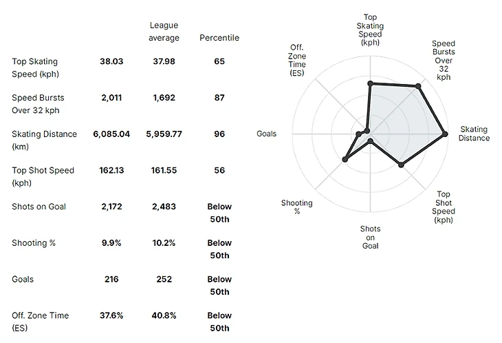 В этом восьмиугольнике стоит обратить внимание на показатель пройденной дистанции. Перцентиль 96 означает, что «Вашингтон» пробежал за сезон больше, чем 96% команд лиги. Также у «Кэпиталс» прекрасный показатель по ускорениям, но по броскам и времени нахождения в чужой зоне значение существенно ниже среднего.