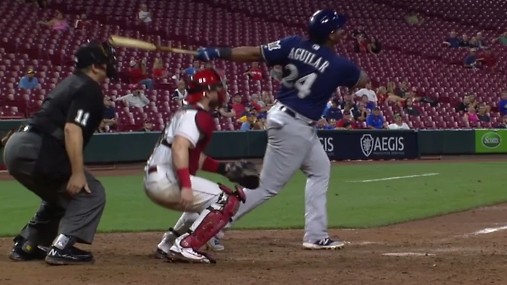 "Цинциннати Редс"-"Милуоки Брюэрс" 12:13.Гости вырвали победу лишь в 10 иннинге.В первом иннинге Трэвис Шоу выбил дабл (23) и Лоренцо Кайн вывел гостей вперёд.Хозяева ответили хоум-раном (4) Билли Хэмилтона.В 4 иннинге Такер Барнхарт выбил хоум-ран (9) и вывел хозяев вперёд.В 5 иннинге Кристиан Йелис своим хоум-раном (26) отправил Лоренцо Кайна в дом,выведя гостей вперёд.Хозяева ответили даблом (28) Скутера Дженнета и забеганиями Дилсона Эрреры и Билли Хэмилтона.Затем Эухенио Суарес своим хоум-раном (30) отправил Скутера Дженнета в дом.В 6 иннинге Майкл Лоренцен своим хоум-раном (4) отправил Такера Барнхарта и Курта Касали в дом,увеличив отрыв хозяев.В 7 иннинге Джонатан Шуп своим хоум-раном (20) отправил Майка Мустакиса в дом,сократив отставание гостей.Затем Лорнцо Кайн выбил дабл (23) и Эрик Кратц сократил разницу в счёте до минимума.Далее Кристиан Йелич выбил трипл (5) и Лоренцо Кайн сравнял счёт в матче.В 8 иннинге Майк Мустакис выбил хоум-ран (25),выведя гостей вперёд.Хозяева после ошибки обороны гостей усилиями Билли Хэмилтона снова сравняли счёт в матче.В 10 иннинге Хесус Агилар выбил хоум-ран (30) и гости снова вышли вперёд.Хозяева ответили хоум-раном (3) Брэндона Диксона.Реливер гостей Джереми Джеффресс (7-1) заработал 22 страйка.один флай-аут и два гранд-аута.