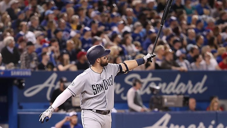 "Торонто Блю Джейс"-"Сан-Диего Падрес" 4:19.В первом иннинге Джош Нэйлор выбил дабл (1) и Грэг Гарсиа открыл счёт в матче.Во втором иннинге Уил Майерс выбил хоум-ран (8).Затем Иан Кинслер выбил хоум-ран (6).Хозяева ответили хоум-раном (2) Лурдеса Гурриэля.В 4 иннинге Остин Хеджес своим гранд-слэмом (6) отправил Хантера Ренфро,Уила Майерса и Иана Кинслера в дом.Хозяева ответили хоум-раном (9) Джастина Смоака и забеганием Владимира Герреро.В 5 иннинге после ошибки питчера хозяев Манни Мачадо забежал в дом.Затем после аналогично ошибки Эрик Хосмер принёс гостям ещё одно очко.После попадания мяча в бьющего Хантер Ренфро забежал в дом.В 6 иннинге Хантер Ренфро своим хоум-раном (13) отправил Эрика Хосмера в дом.В 7 иннинге после гранд-аута Грэга Гарсии Уил Майерс забежал в дом.Затем Джош Нэйлор выбил сингл и Иан Кинслер приносит ещё одно очко гостям.В 8 иннинге Эрик Хосмер выбил хоум-ран (8).Затем Хантер Ренфро выбивает хоум-ран (14).Далее Ул Майерс своим хоум-раном (9) отправил Тая Франса в дом.После этого Фил Мэтон выбил сингл и Грэг Гарсиа забежал в дом.В 9 иннинге Фредди Галвис выбил сингл и Джонатан Дэвис уменьшил разрыв в счёте.Питчер гостей Кэл Квантрилл (1-2) сделал 9 страйк-аутов,заработал 6 гранд-аутов и 3 флай-аута.