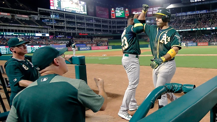 "Техас Рейнджерс"-"Окленд Атлетикс" 9:14.В первой половине матча игра ьыла равная,но потом сказалось преимущество гостей.В первом иннинге Мэтт Олсон выбил хоум-ран (33).Во втором иннинге Крис Дэвис выбил хоум-ран (21).Затем Шелдон Нойс выбил  сингл и Шон Мёрфи прибежал в дом.Хозяева ответили даблом (19) Рональда Гузмана и забеганием Данни Сантаны.Затем Шин Су Чу своим хоум-раном (22) отправил Рональда Гузмана и Хосе Тревино в дом.В 3 иннинге Крис Дэвис своим хоум-раном (22) отправил Рамона Лауреано и Марка Канью в дом.Хозяева ответили хоум-раном (25) Данни Сантаны и забеганиями Вилли Калхуна и Ника Солака.В 4 иннинге после аута Рамона Лауреано Шон Мёрфи сравнял счёт в матче.В 6 иннинге Рамон Лауреано своим хоум-раном (22) отправил Шона Мёрфи и Маркуса Семьена в дом.В 9 иннинге Шелдон Нойс выбил сингл,а Сет Браун и Шон Мёрфи увеличили отрыв гостей.Затем Маркус Семьен своим хоум-раном (29) отправил Шелдона Нойса в дом.Хозяева ответили синглом Элвиса Андруса и забеганиями Ругнеда Одора и Делино ДеШилдса.Реливер гостей Джей-Би Венделкен (2-2) сделал два страйк-аута,заработал 6 гранд-аутов и один флай-аут.