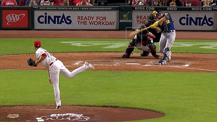В 7 иннинге Вилли Адамс выбил дабл (31) и Кристиан Йелич прибежал в дом.Затем Хантер Ренфро выбил сингл и Вилли Адамс прибежал в дом.Далее Луис Уриас выбил сингл и Хантер Ренфро прибежал в дом.