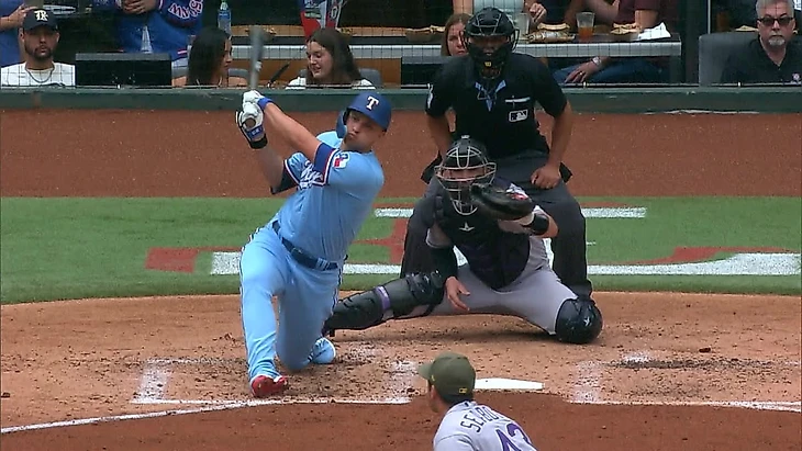 В 5 иннинге Джонах Хейм выбил сингл и Натаниэль Лоу прибежал в дом. Затем Леоди Таверас выбил дабл (8), а Адолис Гарсия с Джошем Янгом и Джонахом Хеймом прибежали в дом. Далее Маркус Семьен выбил сингл и Леоди Таверас прибежал в дом. После этого Кори Сигер выбил дабл (7) и Маркус Семьен прибежал в дом.