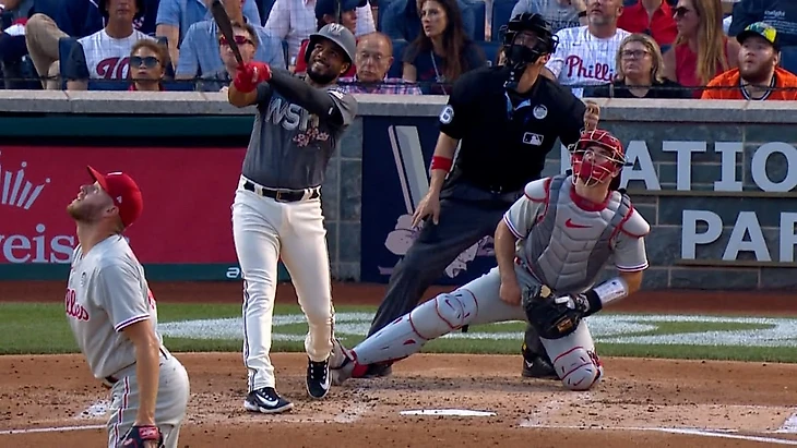 В 6 иннинге Ник Кастельянос своим хоум-раном (7) отправил Брайсона Стотта в дом. Затем Брендон Марш выбил сингл и Тре Тёрнер прибежал в дом.