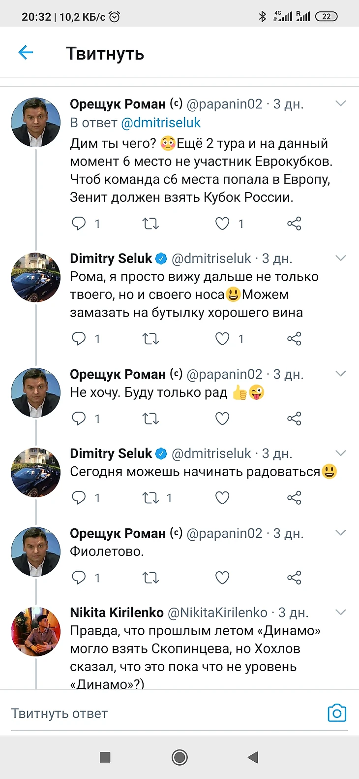 На данное сообщение ответил бывший спортивный директор Динамо Роман Орещук и заявил, что для попадания Динамо в еврокубки, нужно подняться на 6 место и что бы в кубке России победил Зенит. Ответ Селюка был категоричным