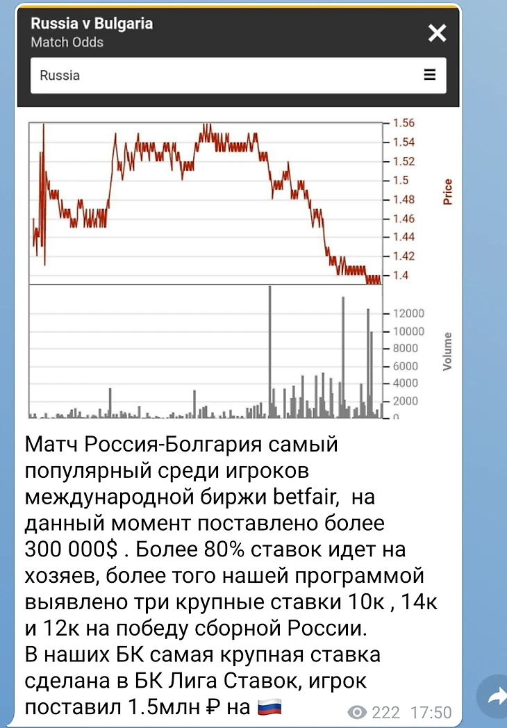 Сегодня состоится товарищеский матч между Россией и Болгарией. Странным образом, данная встреча, привлекла большое количество игроков крупной английской биржи ставок.По данным сервиса PMW , данная встреча самая популярная по обьему ставок и что немаловажно на сборную России сделаны очень крупные ставки