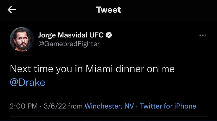 После поражения Хорхе Масвидаль пригласил Дрейка на обед за его счёт как компенсацию за ущерб. Что то нам подсказывает, Дрейк не сильно расстроился