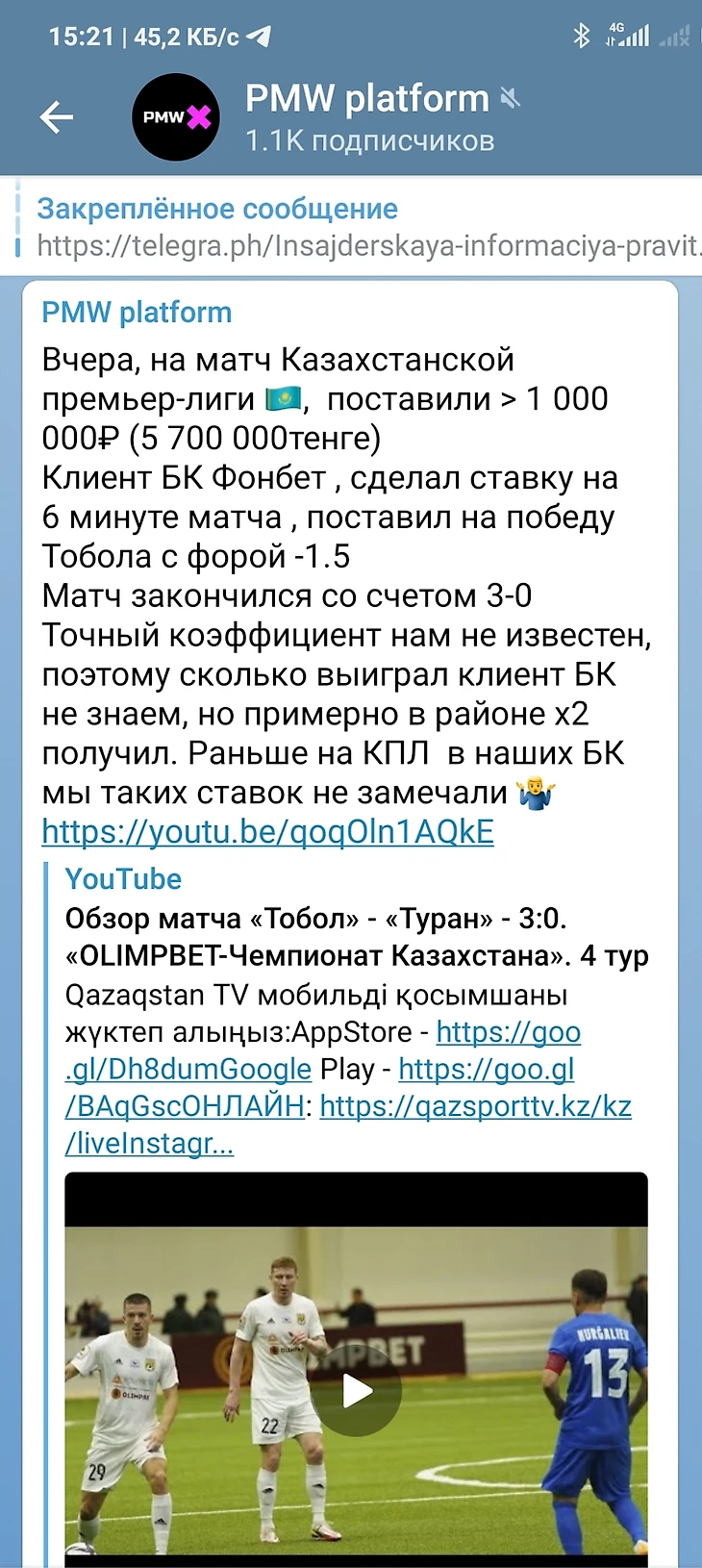 Вчера, по непонятным причинам матч из КПЛ, вызвал небывалый интерес среди любителей ставок в России. На рядовой матч Тобол - Туран, неожиданно была поставлена крупная ставка. По информации сервиса PMW ( данный сервис ищет крупные ставки на спортивные игры) , на победу хозяев с форой -1.5 , неизвестный клиент одной из крупных БК, поставил миллион рублей ( 5 600 000тенге) . В середине первого тайма матч и вовсе был снят с линии практически всех крупных БК страны.