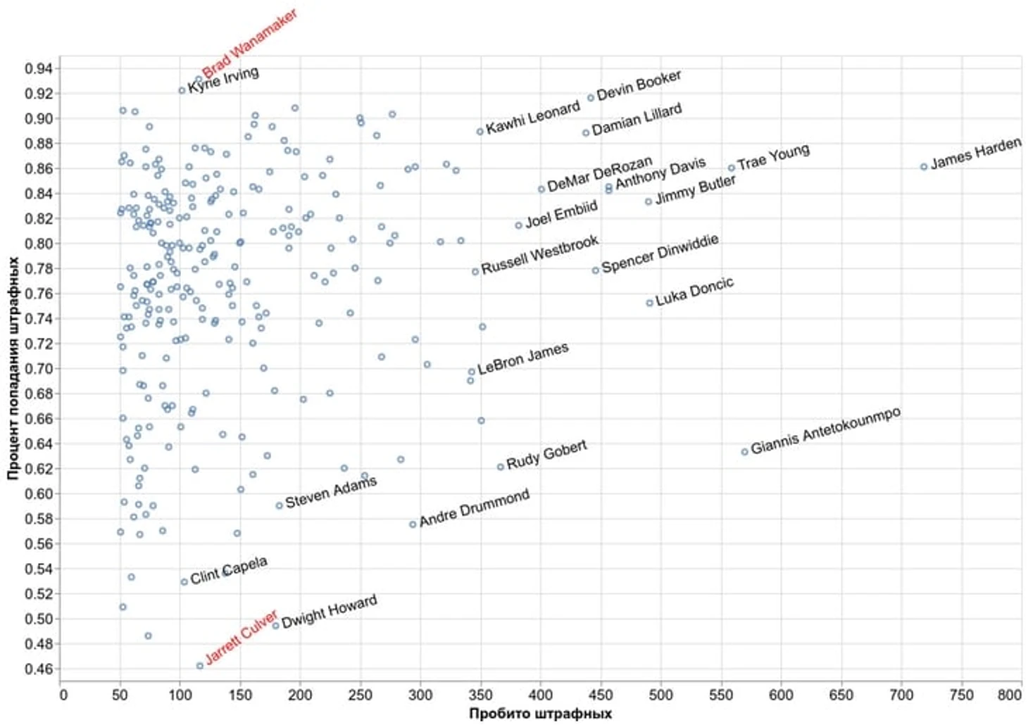 Но кого интересуют средние игроки, всем звезд подавай (ну или хотя бы только тех, кто бросил более 50 раз с линии).