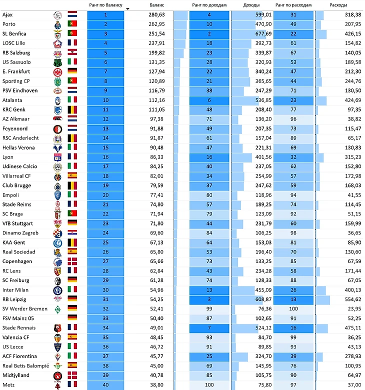«Аякс» – плюс 280 млн €, в Амстердам игроки заплывают и выплывают длинными караванами, а золото остается в Амстердаме. Большой вклад в казну внесли операции с Антони, на его перепродаже в клуб из соседнего сверху рейтинга («МЮ») сделали 80 млн €.
