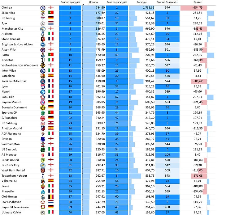 «РБ Лейпциг»: третий по доходам (608 млн €), но высокие расходы (554 млн €) снижают положительный баланс до 54 млн €, отдельное спасибо за положительный баланс «Челси» (в следующем рейтинге объяснение).