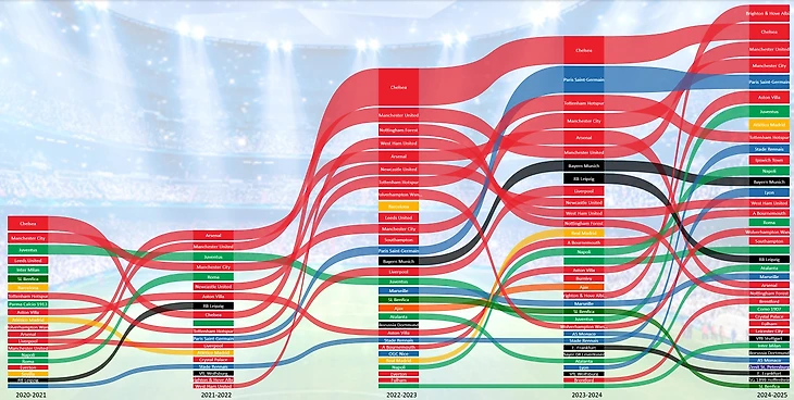 «Челси»: Лидер по доходам (784 млн €), клуб тратит и продает на огромные суммы, в этом есть элемент непоследовательности в управлении командой.