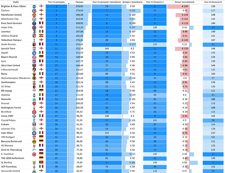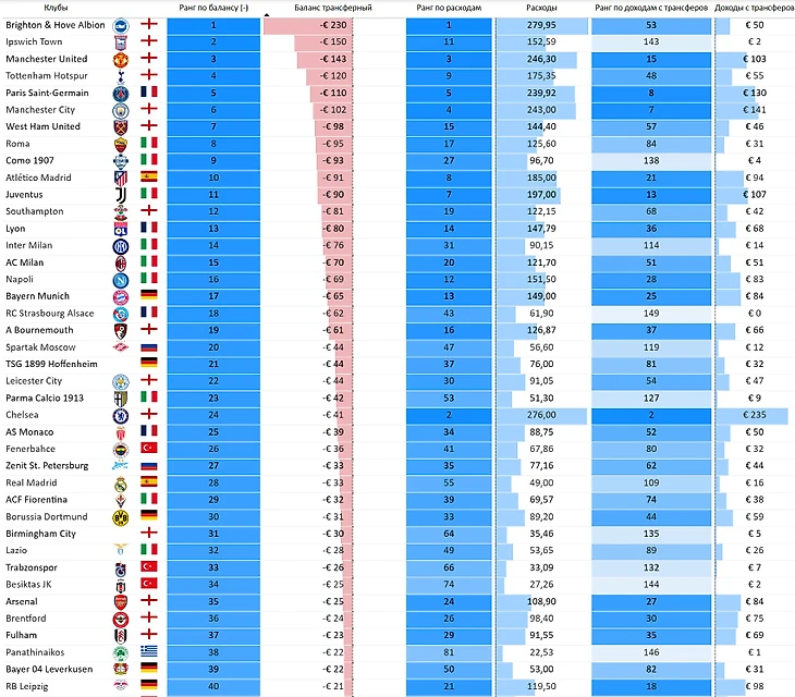 В топ-10 сразу девять клубов из Англии, к ним присоединился «ПСЖ». Если к любому представителю АПЛ в подобных рейтингах мы уже привыкли, то для кого-то может быть удивительно что на 17 месте «Парма» (и это после недавнего банкротства), а на 25 месте «Комо» (у клуба серьезные намерения и не просто закрепиться в Серии А). Сразу два российских клуба в топ-30: «Зенит» и «Спартак» по чистым расходам на трансферы разделяет «Реал Мадрид», а опережают итальянского чемпиона.