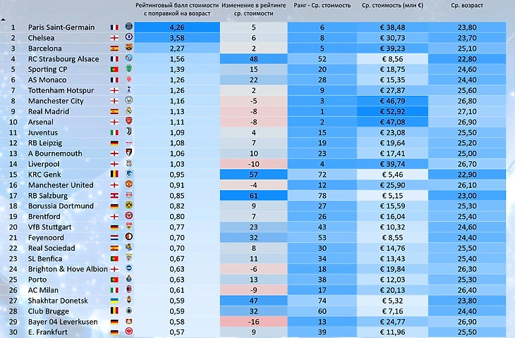 Самая дорогая и молодая команда это «ПСЖ» (наверное, не удивительно видеть такую команду в финале Лиги Чемпионов), бонус за молодость добавил 5 позиций в рейтинге стоимости игроков. Большой бонус получил финалист Лиги Конференций - «Челси» (+6 позиций). Также рейтинг немного бустанул «Барселону» и победителя Лиги Европы «Тоттенхэм» - обе команды добавили 2 позиции.