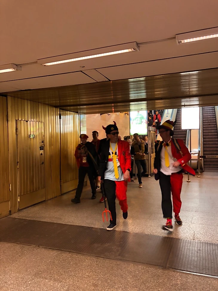 Переходя от спорных вещей к бесспорным, антураж этого матча, его предвкушение и атмосфера точно стоили того, чтобы тащиться в такую даль с пересадками. Я начала понимать, что такое бельгийский отжиг, ещё в метро и продолжила по пути на стадион.