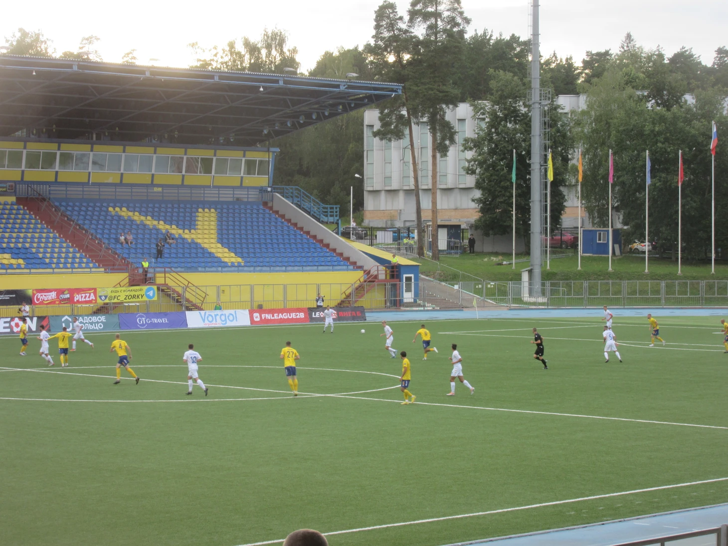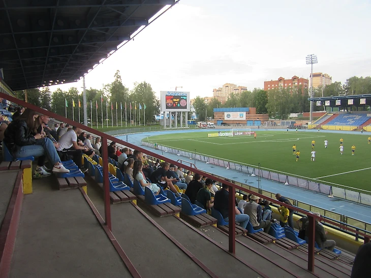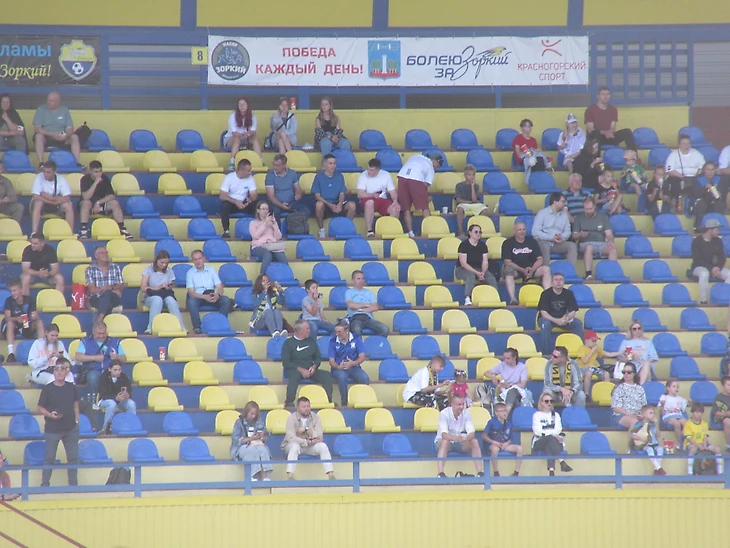В перерыве пара слов о стадионе «Зоркий». Вмещает 8000. Последнюю реконструкцию пережил в 2002 году. В целом нормальный «стадио», который сможет принять и Пердив, то бишь ФНЛ или «наш Чемпионшип». Из олдскульного деревянная основа под сиденья и нанесенные вручную номера рядов.