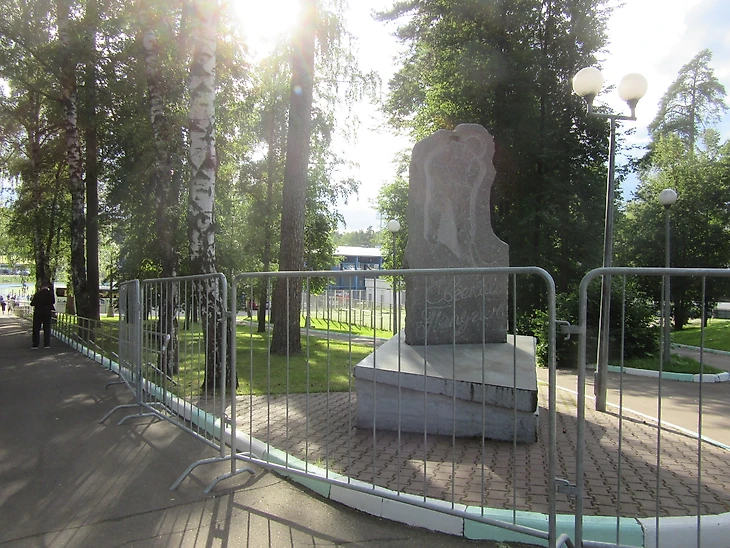 «Зоркий» это прежде всего бенди. После «карман-контроля» и «рюкзак-контроля» наталкиваемся на памятник Евгению Папугину (1933-1995) — спортсмену-универсалу, игравшему в футбол, хоккей на траве и хоккей с мячом, уроженцу поселка Опалиха.