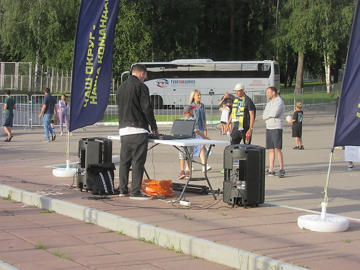 Возле восточной трибуны раскинулся движ, обещанный соцсетями клуба. Диджей, атрибутика, еда. В локальном масштабе.