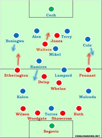 Также наблюдался высокий темп на старте поединка. Джонс и Уолтерс быстро накрывали центральных защитников «Челси», чем мешали Терри и Алексу пасовать мяч в линию полузащиты. Они были вынуждены отдавать его назад на Чеха, который затем выбивал игровой снаряд далеко вперёд. Однако у Торреса было мало шансов на победу в воздушных дуэлях. Уолтерс следил за Джоном Оби Микелем, пытаясь не дать ему вести игру, хотя у нигерийца всё равно было больше касаний мяча, чем у любого другого игрока в первой половине встречи.