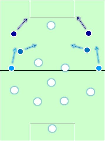 Роли фланговых игроков в системе «Челси» 4-3-3 различны. Голубым цветом обозначены крайние нападающие при Моуриньо. Они стартовали с позиций полузащитников, затем убегали вперёд и присоединялись к одинокому центрфорварду. Синие – половина-на-половину вингеры при Карло Анчелотти: широкая защита и смещения в центр для того, чтобы связывать среднюю линию и нападение. Фиолетовые – их возможные функции при Виллаше-Боаше, располагающиеся «высоко» и резко врывающиеся в штрафную.