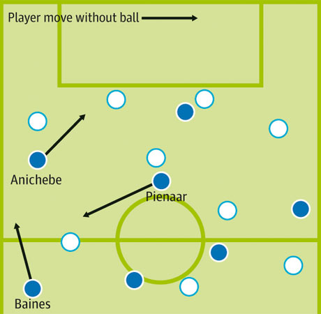 Но в итоге всё оказалось не так просто. Аничебе начал матч на левом фланге, где противодействовал правому защитнику «Челси» Сесару Аспиликуэте, держал мяч, ждал подключений Лейтона Бэйнса и открывался под длинные диагонали от Джонни Хейтинги и Фила Джагелки. В свою очередь, это позволило Стивену Пиенаару переместиться в центр, где он играл связующую роль между двумя линиями, располагаясь позади Елавича.