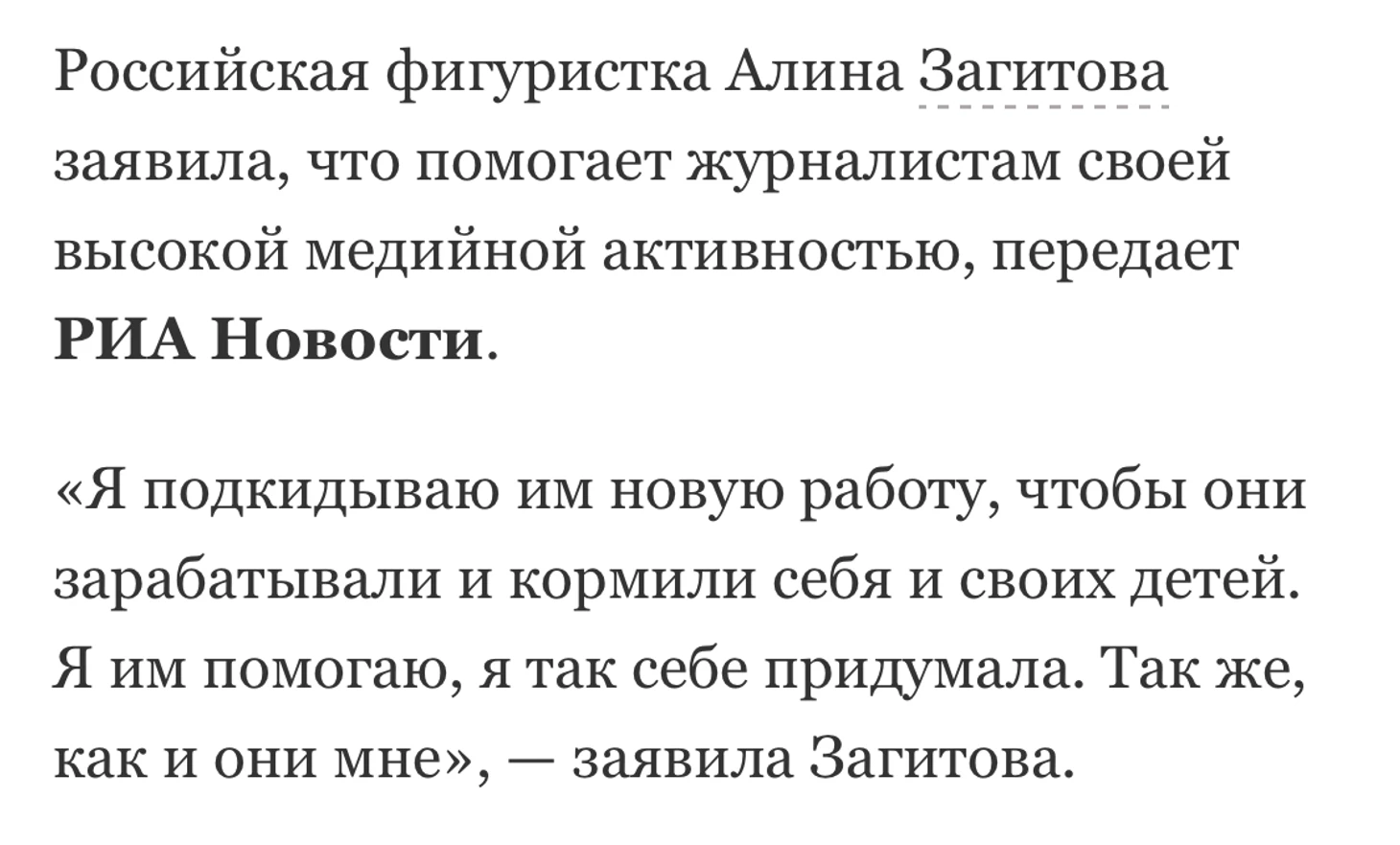 Вообще «тренд» на ответы и нападки «хейтерам» (здесь важно понимать, что в понимании Загитовой Алины и ее самых преданных фанатов «хейтеры» – те, кто не бесконечно нахваливает Алину, а хоть как-то критикует) задала сама Алина – в своих интервью, или постах она с очень часто упоминала «хейтеров», не забывая добавлять, что ее фанаты – ее «стена», за которой она прячется, а в какой-то момент перешла все грани разумного и заявила, что она «кормит журналистов и их детей»