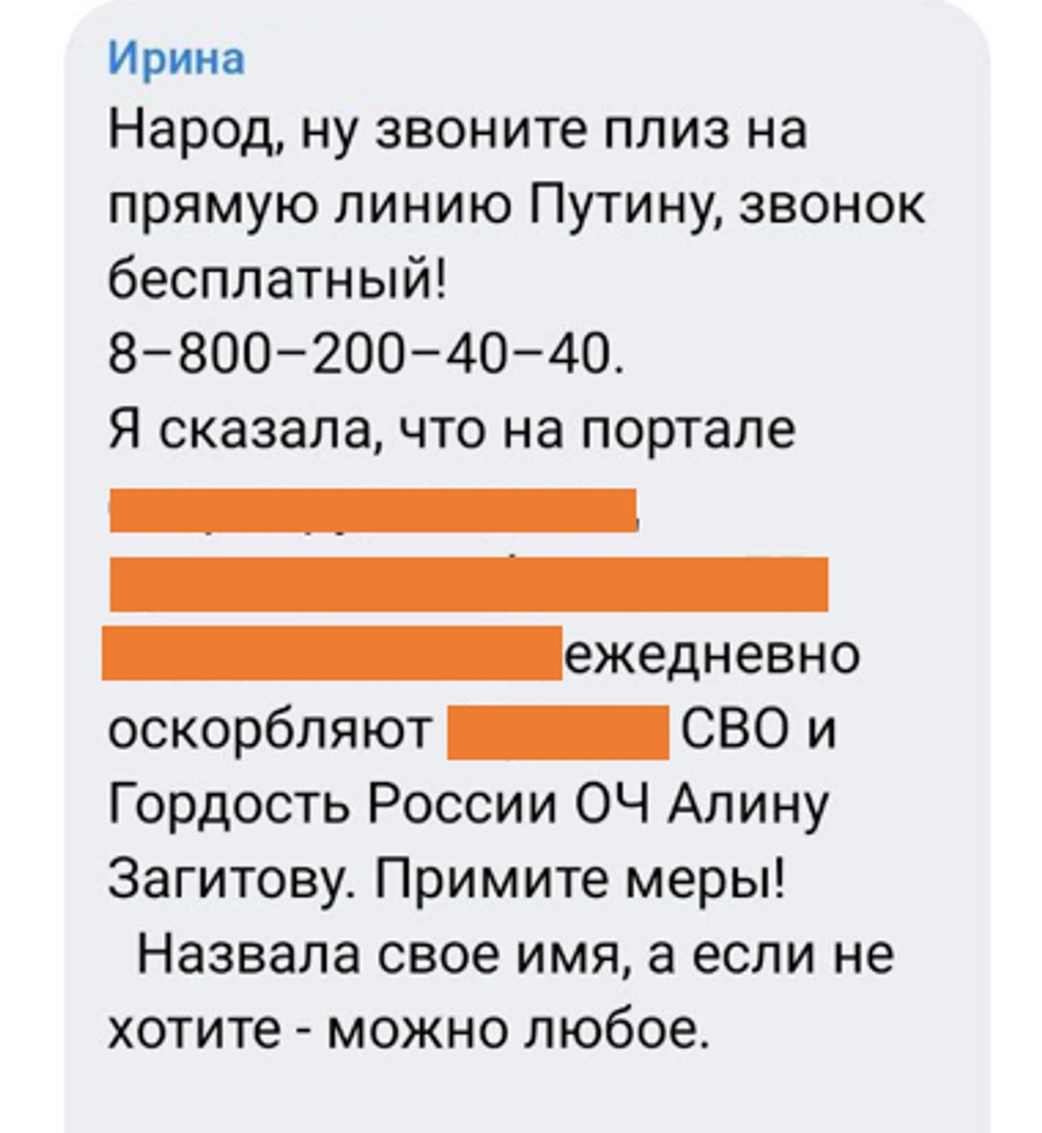 Письма были в том числе в РКН, Михалкову, Соловьеву и даже на прямую линию с Президентом России дозвонились! Кстати там, они самозабвенно говорили, что «оскорбляют» Гордость России Алину Загитову!