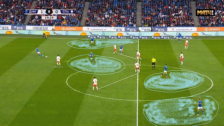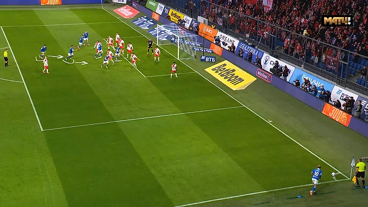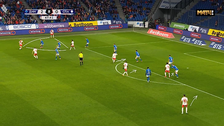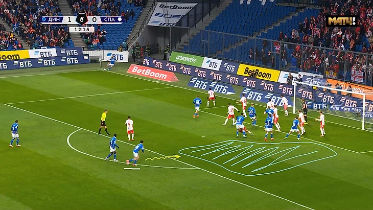 «Динамо» в этом сезоне в топе РПЛ по голам и моментам с угловых. Но «Спартак» странно подошёл к решению этой проблемы (а вообще решал ли?). Они использовали зонную оборону с двойным контролем ближней штанги и двумя игроками на второй линии для сдерживания.