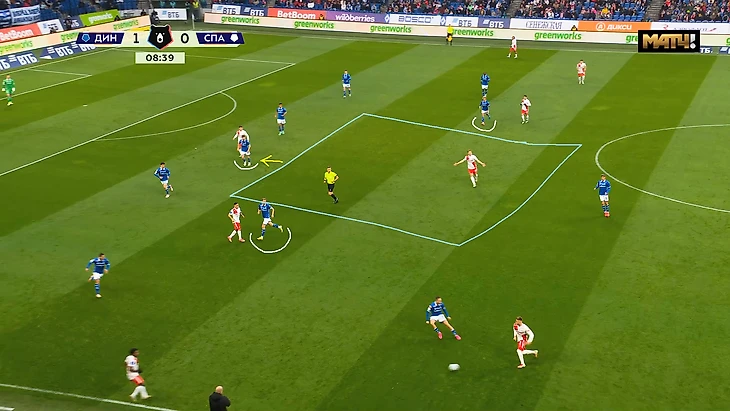 Видно, что «Спартак» пытается держать чёткую структуру 5-4-1, но схема даёт лишь изначальное позиционирование. Дальнейшие перемещения внутри структуры должны зависеть от ситуации и положения соперников. Поэтому здесь мы видим свободу у четверых игроков соперника, плюс центральный защитник, начинающий атаку тоже на открытом мяче. Эта схема хороша для позиционной обороны, например её используют «Рубин», «Ростов», «Факел», «Пари НН», но они обороняются по ней на своей половине поля. При давлении же она обычно перетекает в 5-2-3, где верхняя пятёрка давит на «мяч», а нижняя - поджимает и контролирует линию оффсайда, например - «Динамо Мх». У «Спартака» же не было ни первого, ни второго варианта