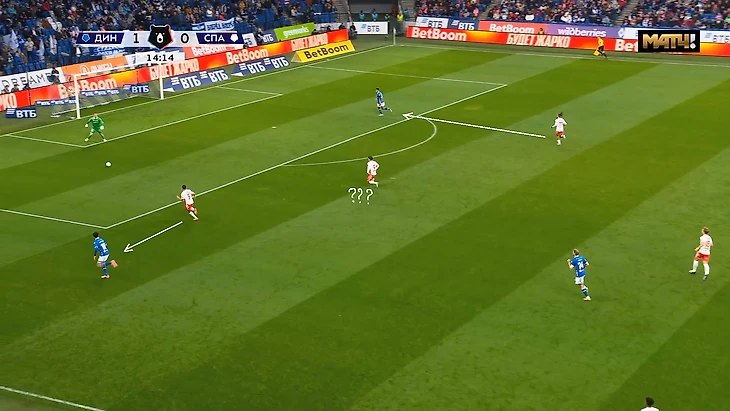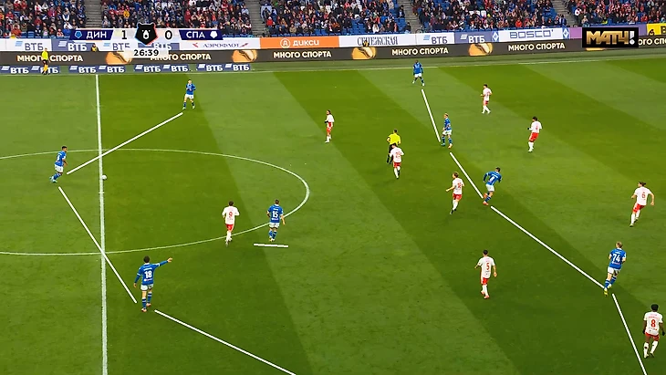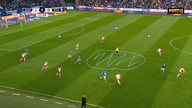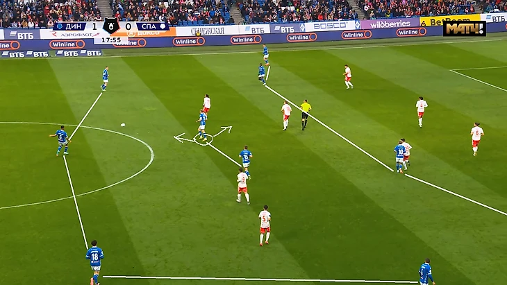 Ниже ещё один пример, когда Маричаль обрезает передачей сразу 5 игроков «Спартака», а Гладышев после стенки с Глебовым отправит в забег 1в1 Нгамалё. Момент закончится опасным ударом Бителло и последующим угловым.