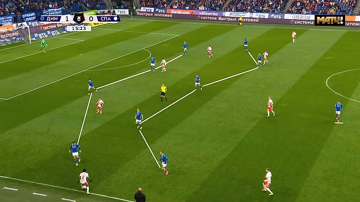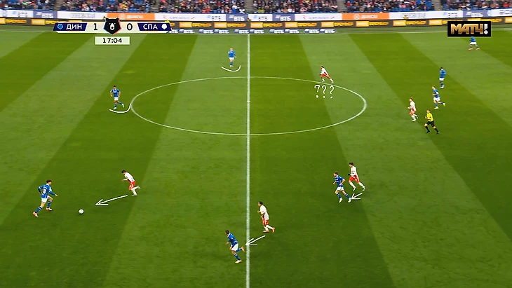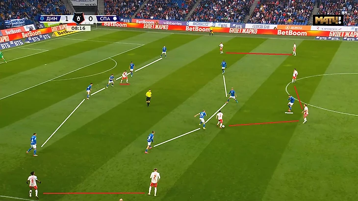 Напомню, что «красно-белые» позиционно оборонялись 5-4-1 и в давление шла только верхняя пятёрка, без Маркиньоса. При этом соперник всегда для выхода в атаку располагается в первой стадии 4+2. «Динамо» тоже шло в давление в минус одного игрока, но они двигались чётко по инструкции, без провалов. А «Спартак» вот так: