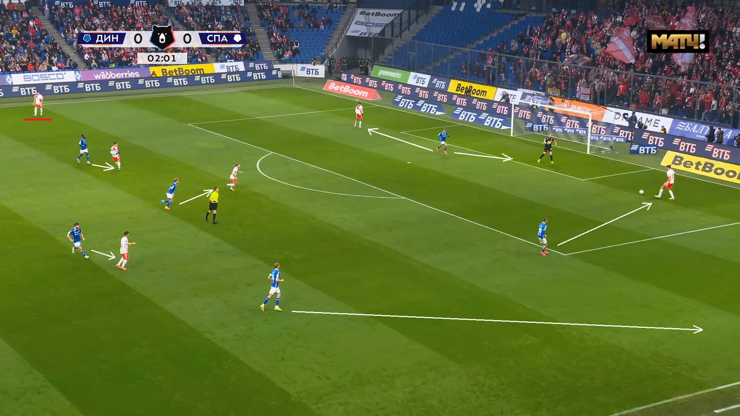 По этой причине команда по долгу проводила время в позиционной обороне, т.к. данное расположение давало численное преимущество в первой стадии «Динамо». Вдобавок к этому, при переходах владения б0льшая часть игроков была у своей штрафной и адресов впереди кроме одинокого Угальде у «красно-белых» не было. Это вело к безадресным выносам и повторному владению «динамовцев». Ситуация продолжалась, пока счёт не стал 2:0 и итоговое владение за тайм было примерно равным (47-53%).