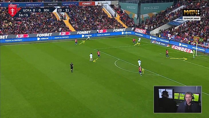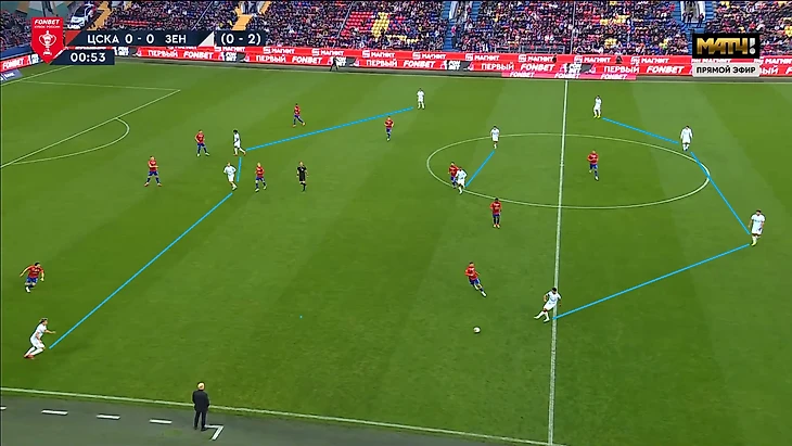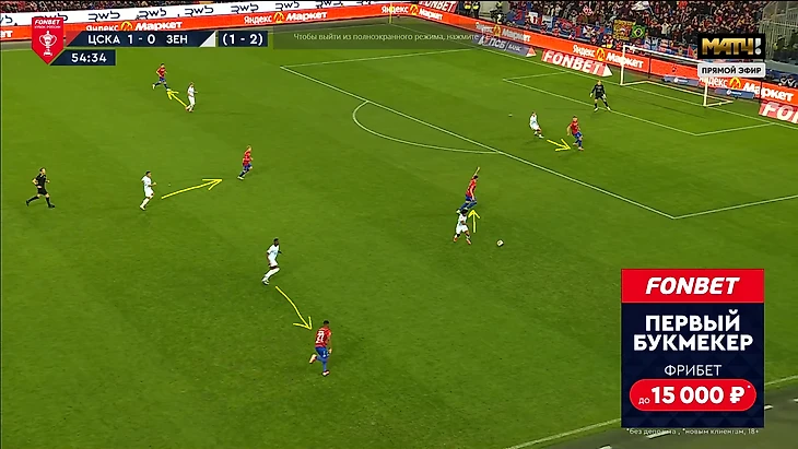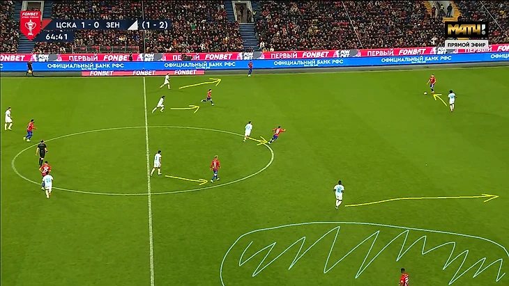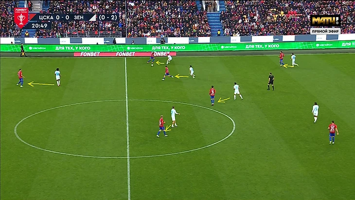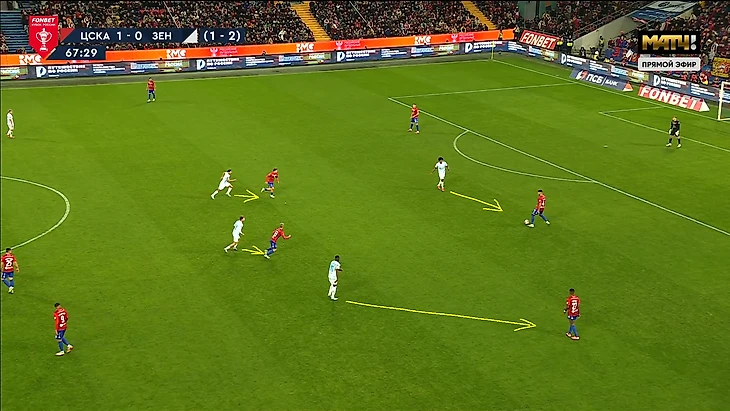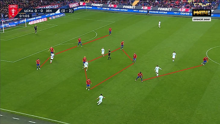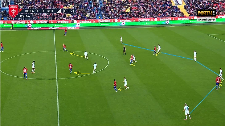 Сложность прессинга «Зенита» в этих двух играх с «ЦСКА» заключается в том, что Сергей Семак не хочет рисковать и играть с соперником 1в1 по всему полю, как, например, это делал «Краснодар» в прошлой игре. Поэтому в оборонительной структуре 5-4-1 центральный защитник Нино был без игрока и выполнял роль страхующего. Соответственно, впереди было на одного игрока меньше, поэтому Кассьерре или Глушенкову всегда нужно было закрывать двух игроков одновременно, благодаря грамотному движению и выбору момента для оказания давления. Они справлялись с этим достаточно качественно, сначала направляя атаку «ЦСКА» на один из флангов, а далее разбирая всех 1в1 кроме дальнего защитника.