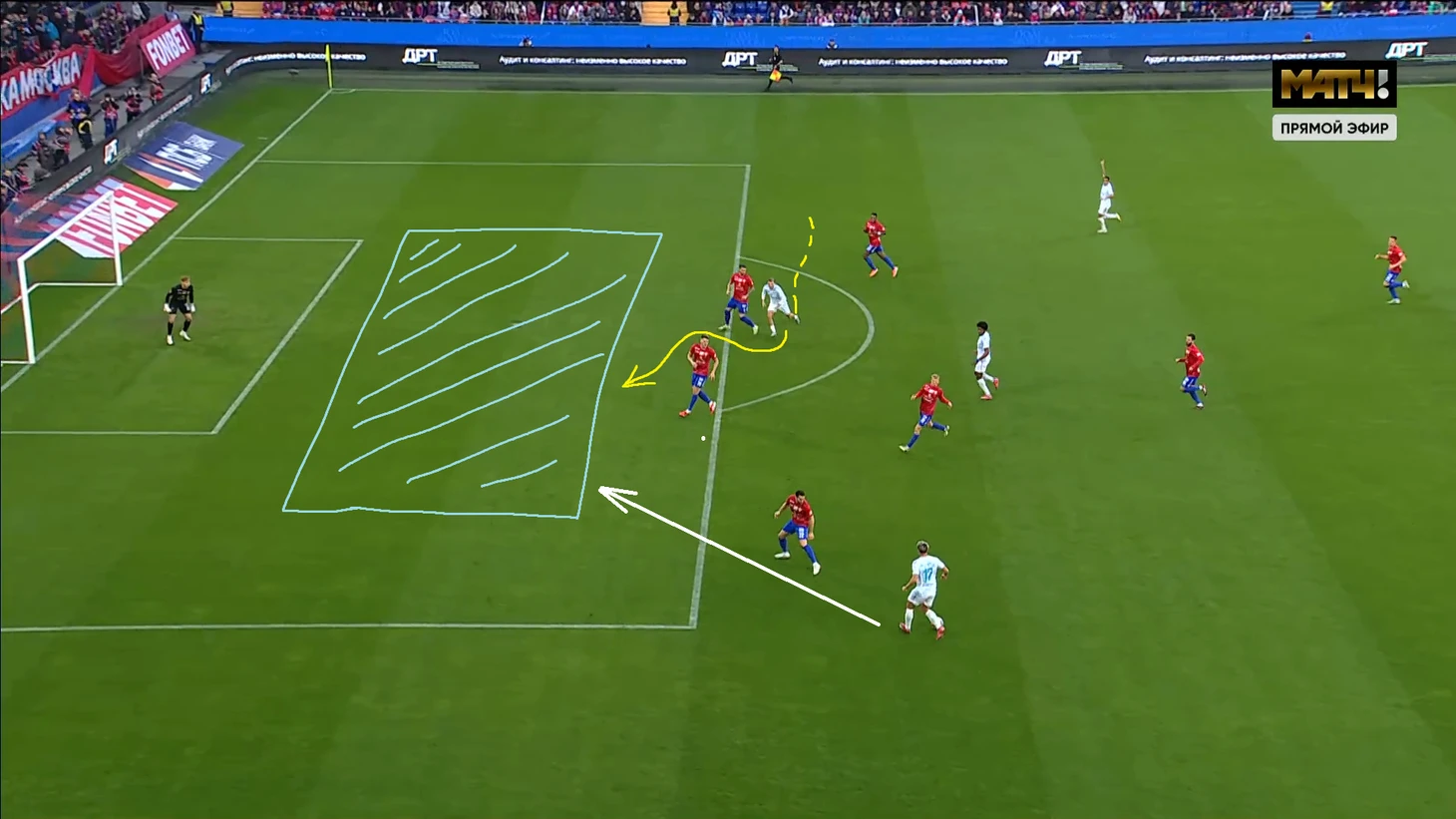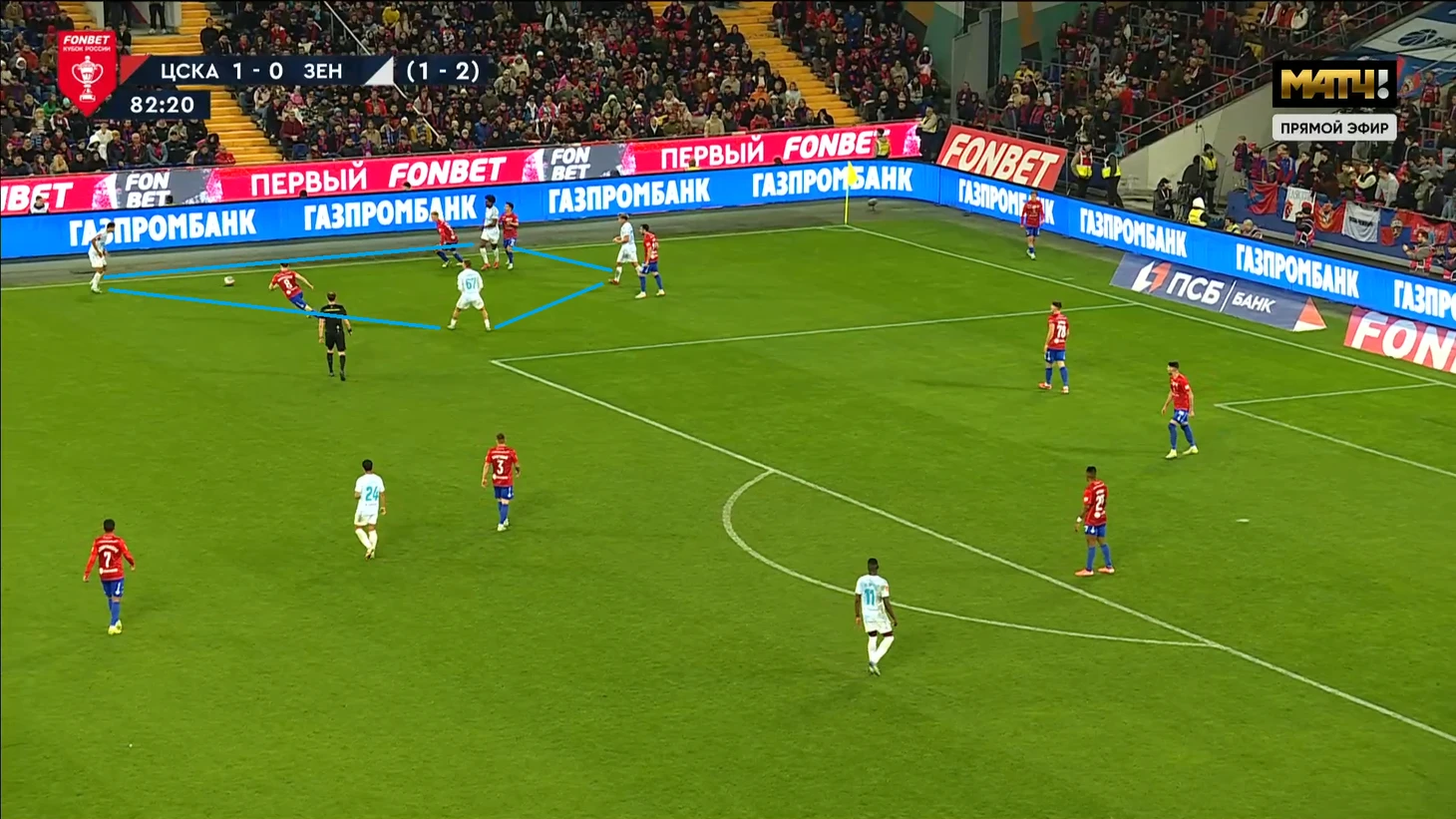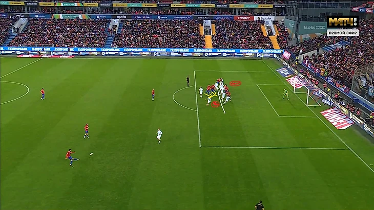 Штрафной удар с правого фланга, который привёл к пенальти, был уже вторым по ходу игры с той же точки. Оба раза 2-3 игрока ставили блок центральным защитникам «Зенита», а из под их опеки врывался Роша/Гуарирапа/Дивеев, имея пространство и преимущество в движении.