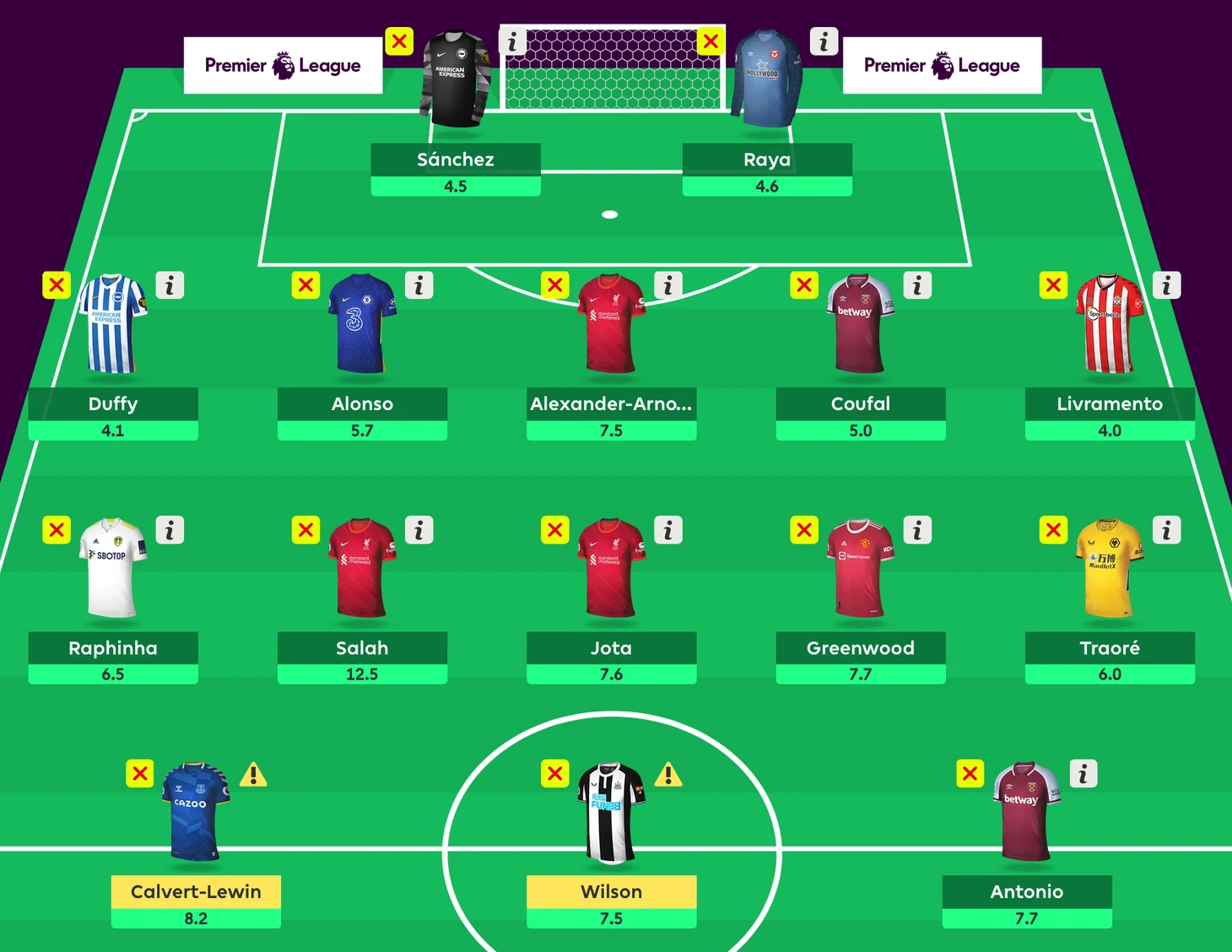 Третьим форвардом я выбрал Каллума Уилсона, влияние которого на «Ньюкасл» невообразимо – в прошлом сезоне он поучаствовал в 37% голах своей команды. На старте этого сезона Уилсон успел показать, что он еще может зажечь, несмотря на свой возраст – 10 ударов и 2 забитых мяча. Единственное, что может ему помешать, это травмы, из-за которых он пропустил треть предыдущего сезона.